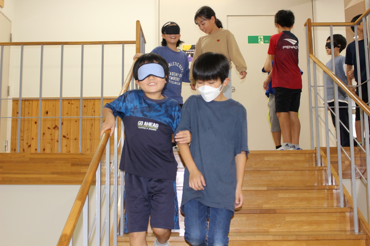 視覚障がいについての学習をした後、実際にアイマスクを着用し、階段や廊下を歩いてみました。