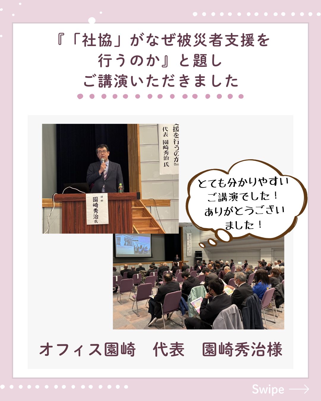 続いて行われた講演会では、近年相次ぐ自然災害を背景に「『社協』がなぜ被災者支援を行うのか」と題し、オフィス園崎 代表の園崎秀治様をお招きしご講演いただきました。被災者支援の三原則である「被災者中心・地元主体・協働」について具体的な事例を交えながら非常に分かりやすくご講演いただきました。